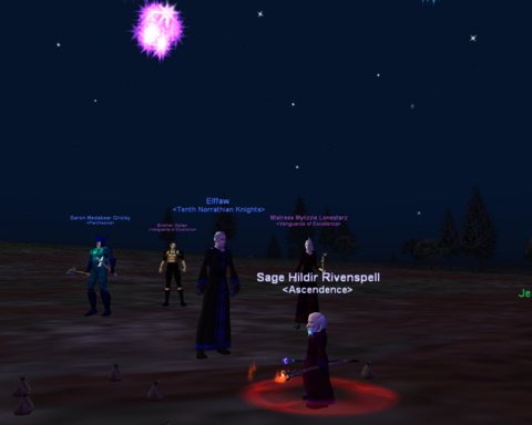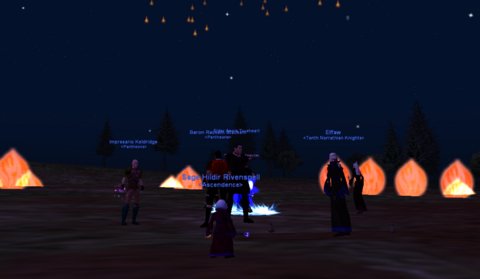 As most weddings go there always seems to be that one guy that has to get in to trouble. Well this wedding was no different, it could have been quite dangerous, you know with mages, wizards and all that good stuff. Heck with duke it out... they decided to nuke it out. Hildir was always a michievous wizard, so him and one of the other wizzy's decided to almost kill eachother. It was interesting to watch as Hildir's pets would attack and the nukes would blaze through the evening sky. The nukes were almost better than watching the fire works.